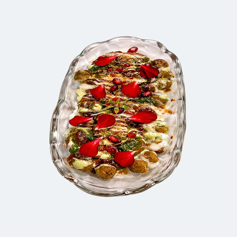 A crispy samosa or aloo tikki topped with chickpea curry, creamy yogurt, tangy tamarind and mint sauces, finished with a sprinkle of aromatic spices. (CG, NF, CD)
