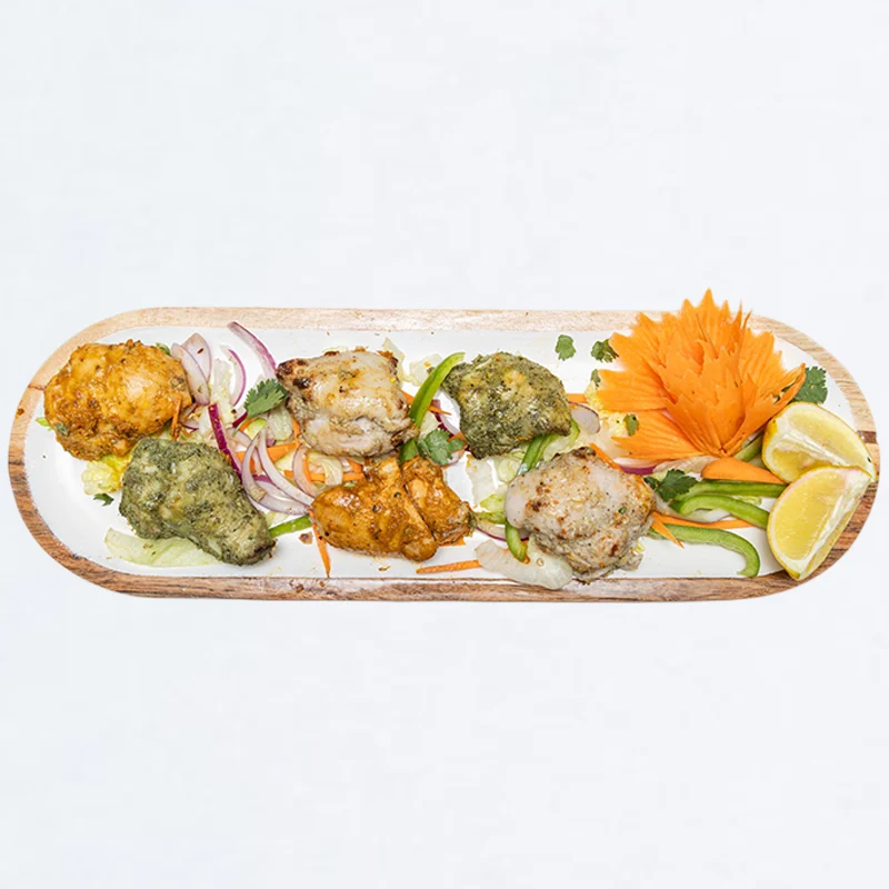 3 different style mouth-watering chicken appetiser plate which is chicken tikka, malai tikka, achari tikka (2 pcs each). (GF, CN, CD)