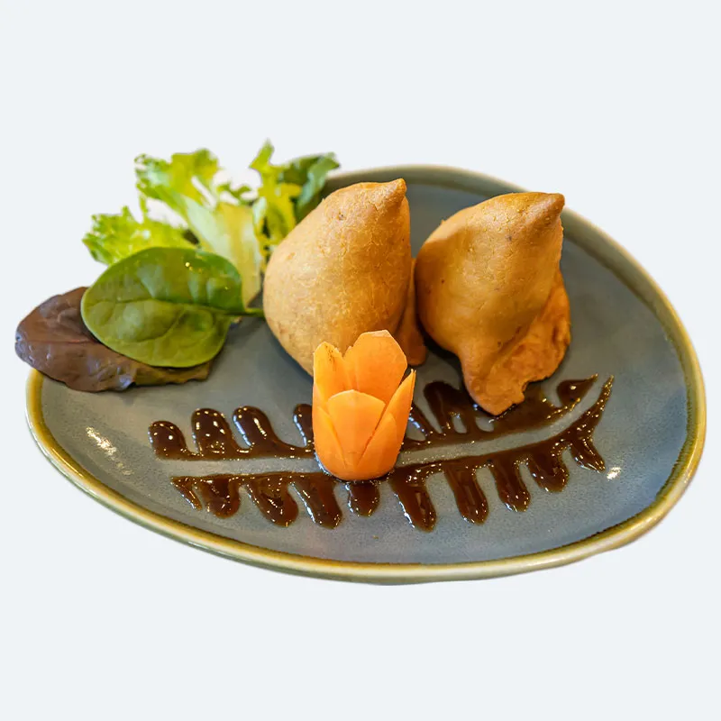 Two pieces. Mild spicy. Contains gluten and nut free. Shortcrust pockets filled with potatoes, peas, spices and herbs, then deep fried until golden brown. Served with mint sauce.